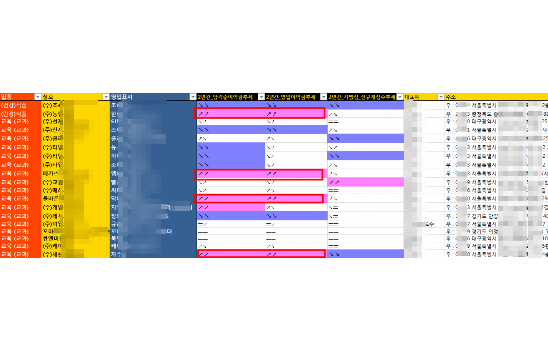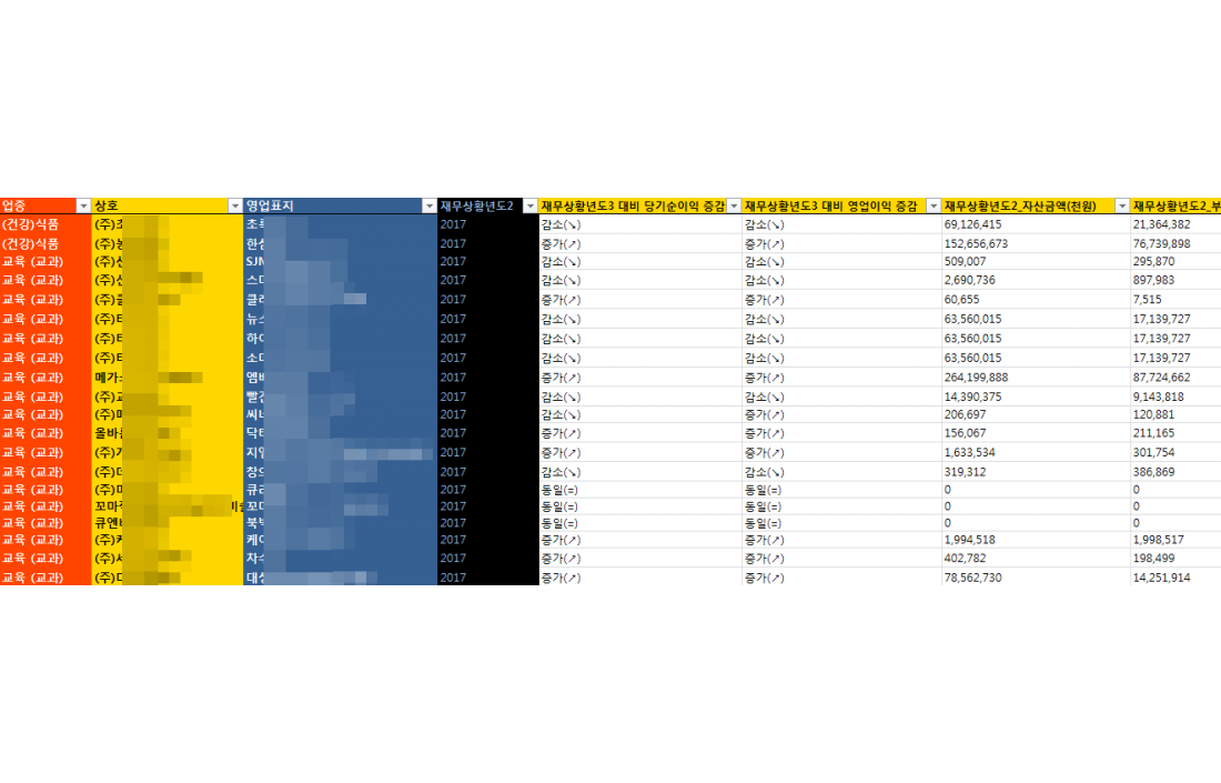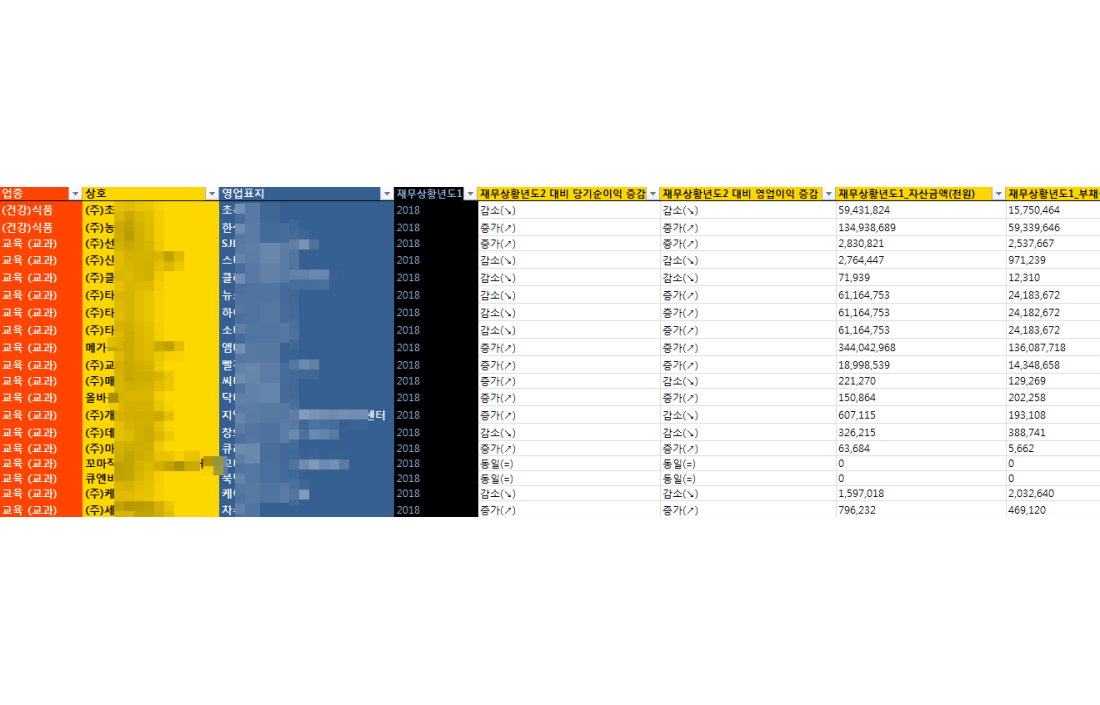 최근년도 기준하여 연속 상승한 경우와 연속감소하는 경우 + 법적소송건수의 여부등의 셀안에 색상을 입혀서 한눈에 구분이 용이하도록 구성하였습니다.