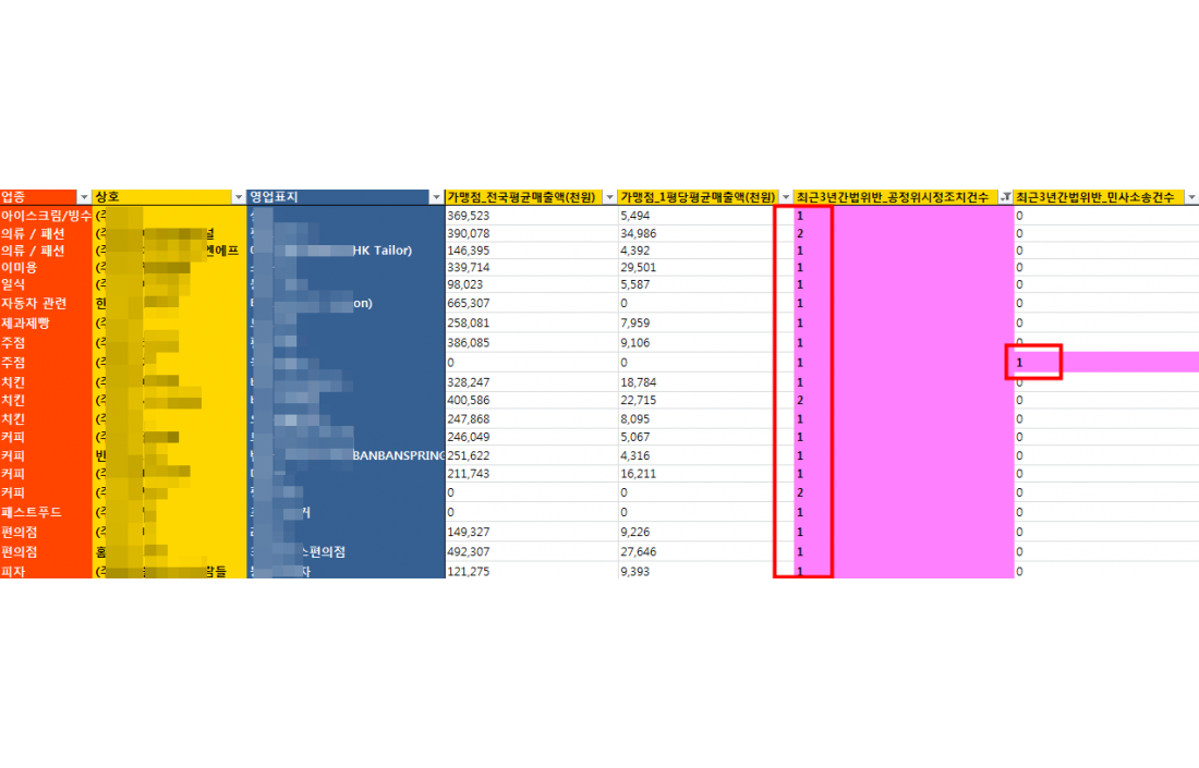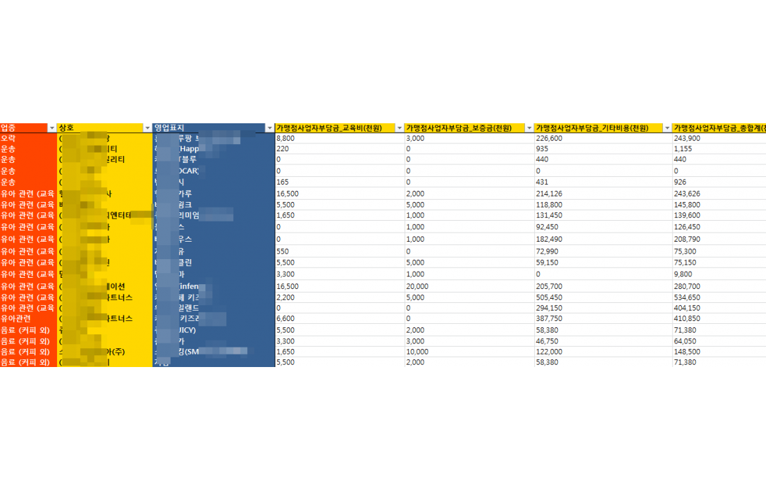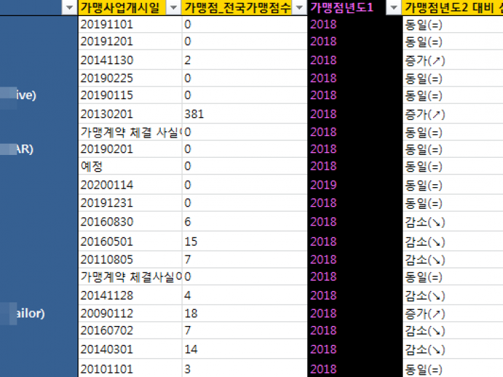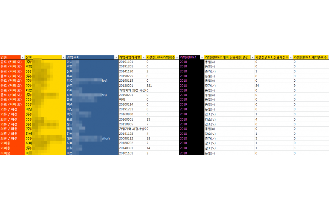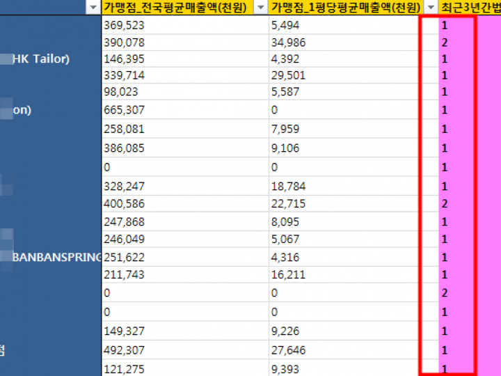 가> 수십~수백개의 동일업종내 프랜차이즈들의 영업이익 ,매출 ,소송건수등등을 한꺼번에 비교하여 보시고자 하시는 분들