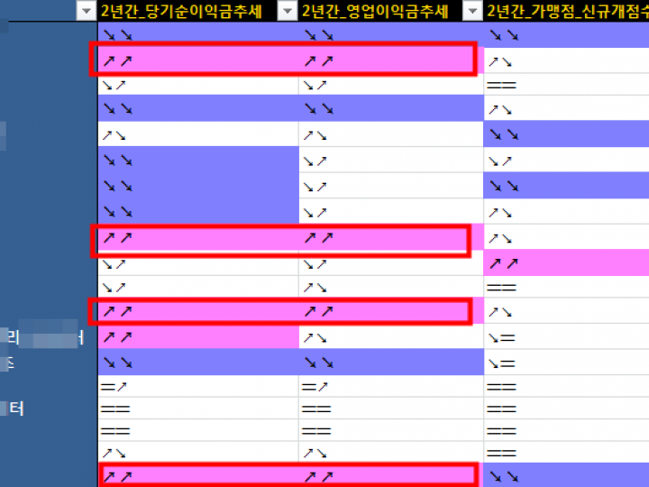 가> "↗↗" : 당기순이익이 2년 연속 증가 됬음을 의미