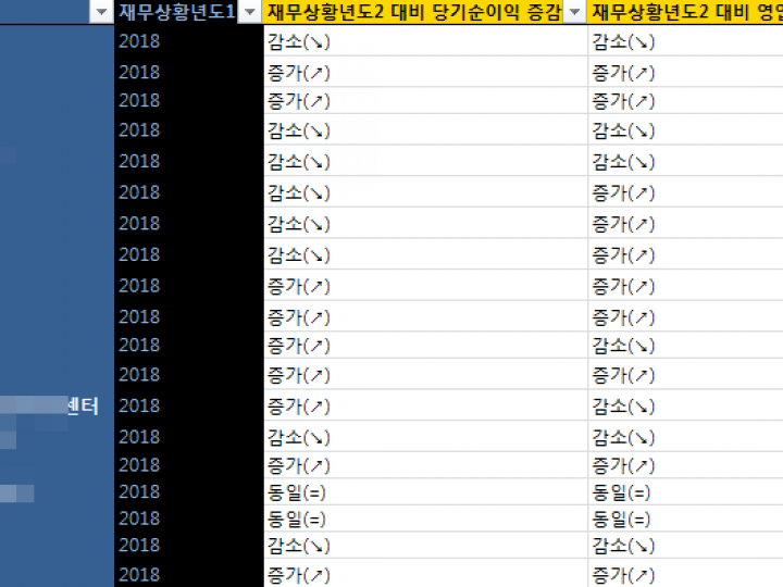 나> "↘" : 감소 (예> 신고된 최근년도가 2019년 일 경우 2018년이익금(700원) / 2019년이익금(300원))