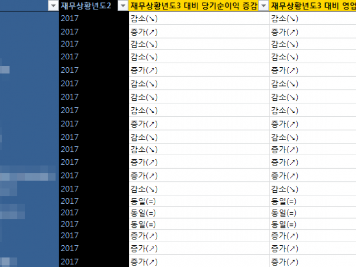 사> "〓↘" : 당기순이익이 최근년도기준-2년째와 최근년도기준-1년째는 변동이 없다가 최근년도에는 최근년도-1년에 비해 이익금이 감소한 경우를 의미