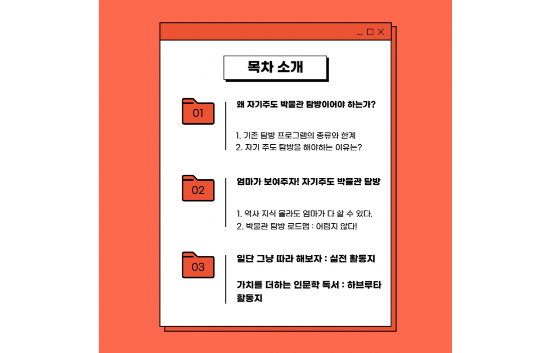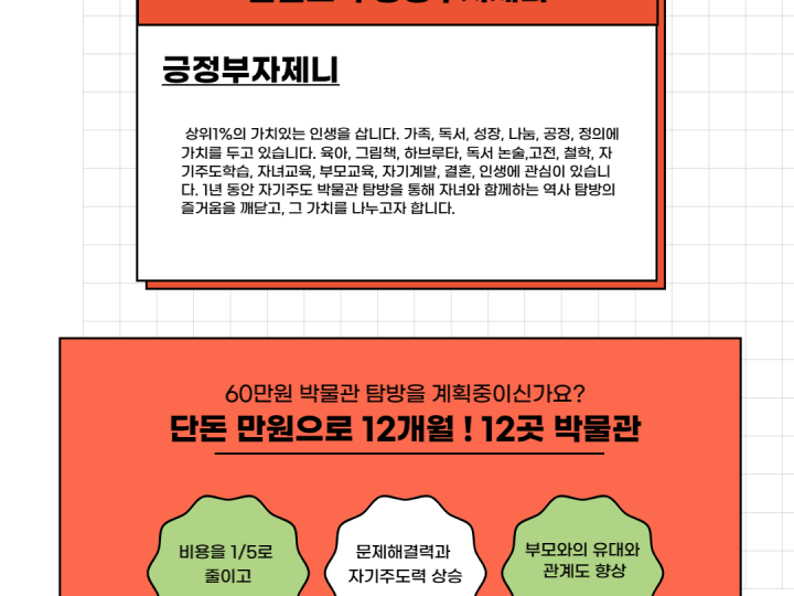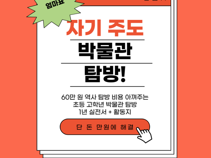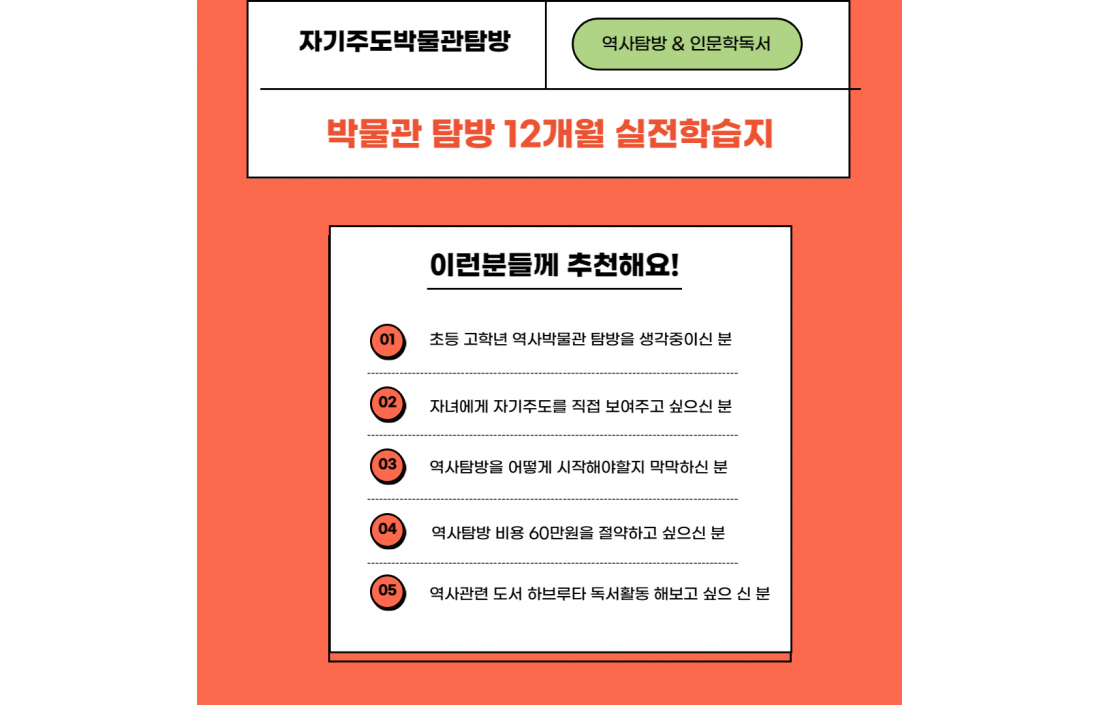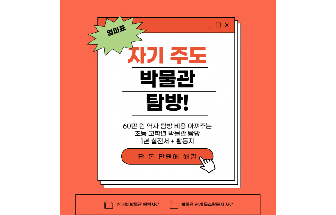제가 안내해 드린대로 그대로 1년을 진행해 보시고, 그 자신감으로 더 많은 다양한 곳을 준비하여 진행하시면 됩니다. 비싸게 1년에 60~80만 원 들여서 박물관 탐방 진행하지 않아도 됩니다.