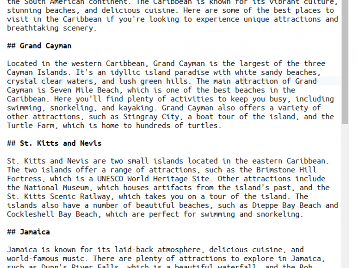 Jamaica is known for its laid-back atmosphere, delicious cuisine, and world-famous music. There are plenty of attractions to explore in Jamaica, such as Dunn's River Falls, which is a beautiful waterfall, and the Bob Marley Museum, which is a must-visit for fans of the reggae legend. Jamaica is also home to a number of beautiful beaches, including Seven Mile Beach and Negril Beach, which are both great for swimming and snorkeling.