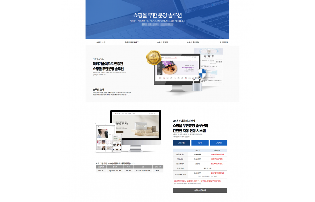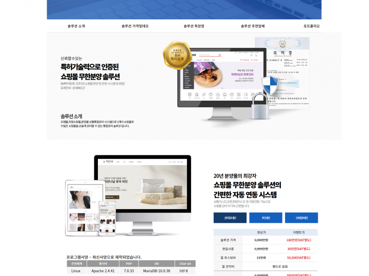 - 기존의 기술력을 바탕으로 분양몰 시스템,네트워크 정산 시스템 등 여러가지 솔루션을 저렴하게 제공해 드리고 있습니다.