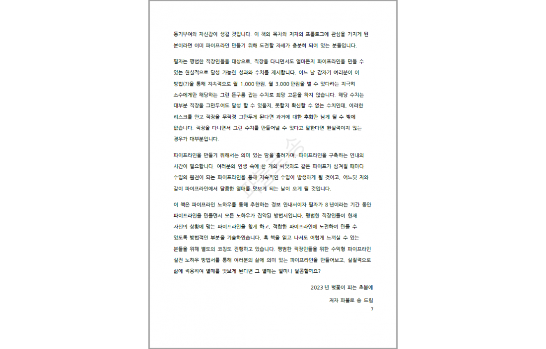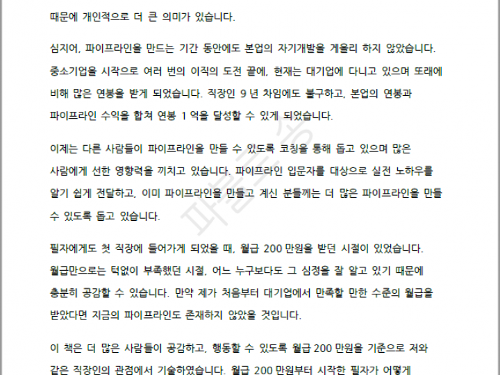 평범한 직장인이 본업을 지키면서도 파이프라인 만든 법을 통해 부가적인 수익 얻기에 도전하실 수 있습니다.