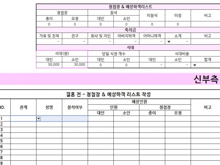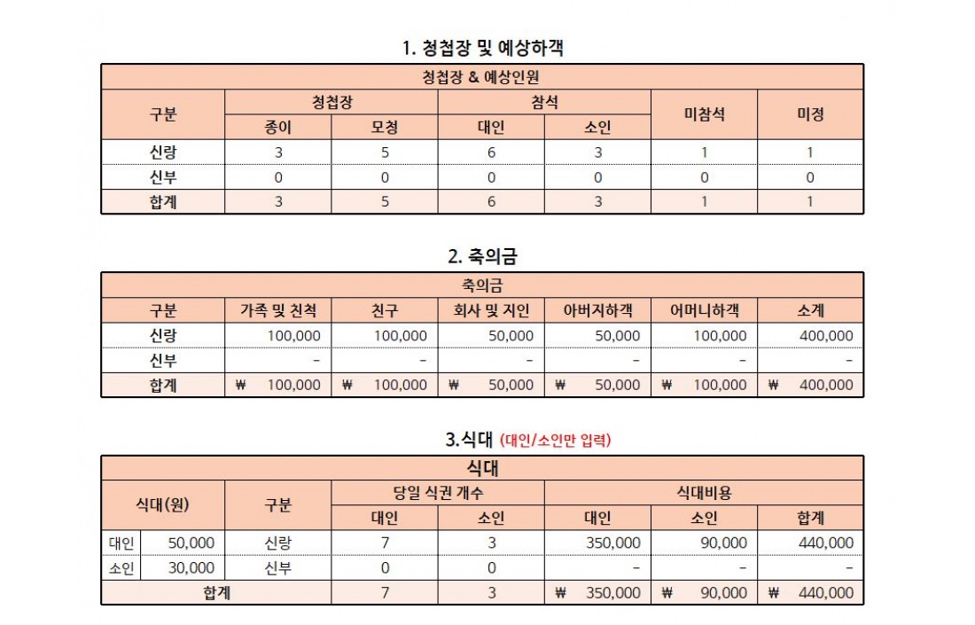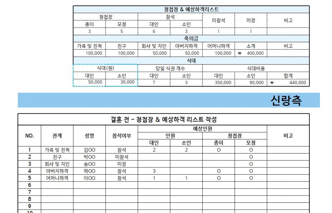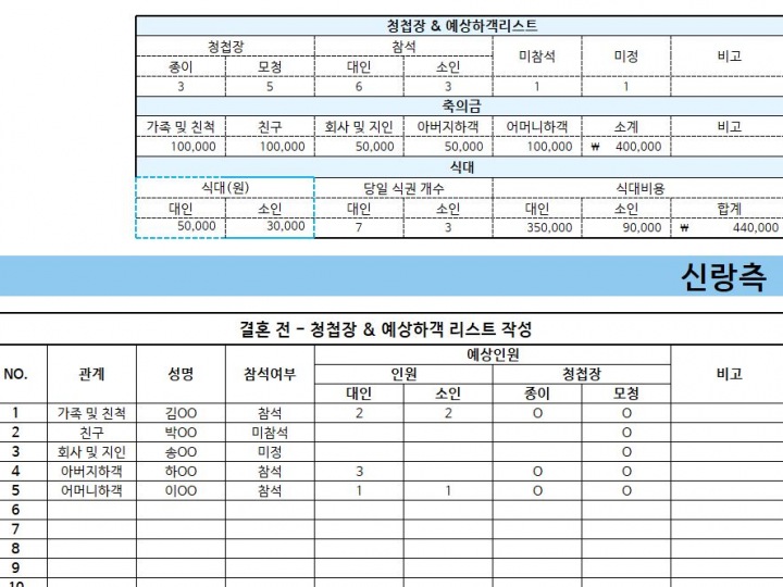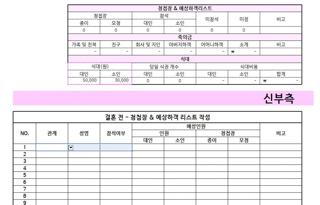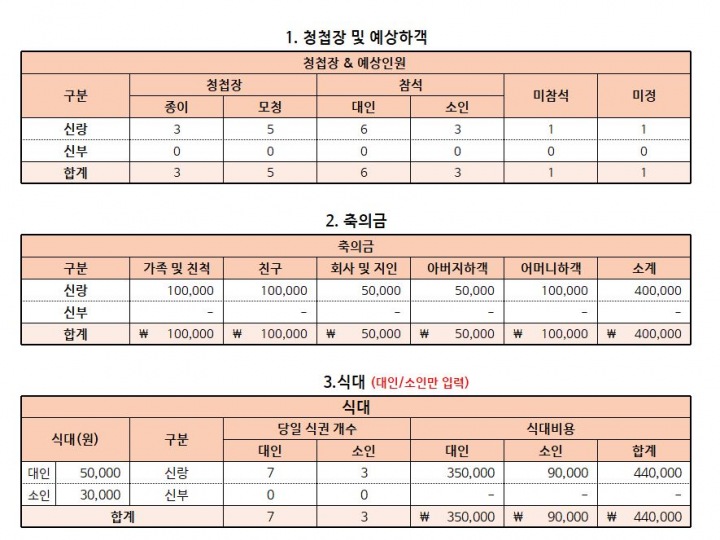 신랑, 신부 각 시트에서 예상인원파악 / 축의금 /식대 파악