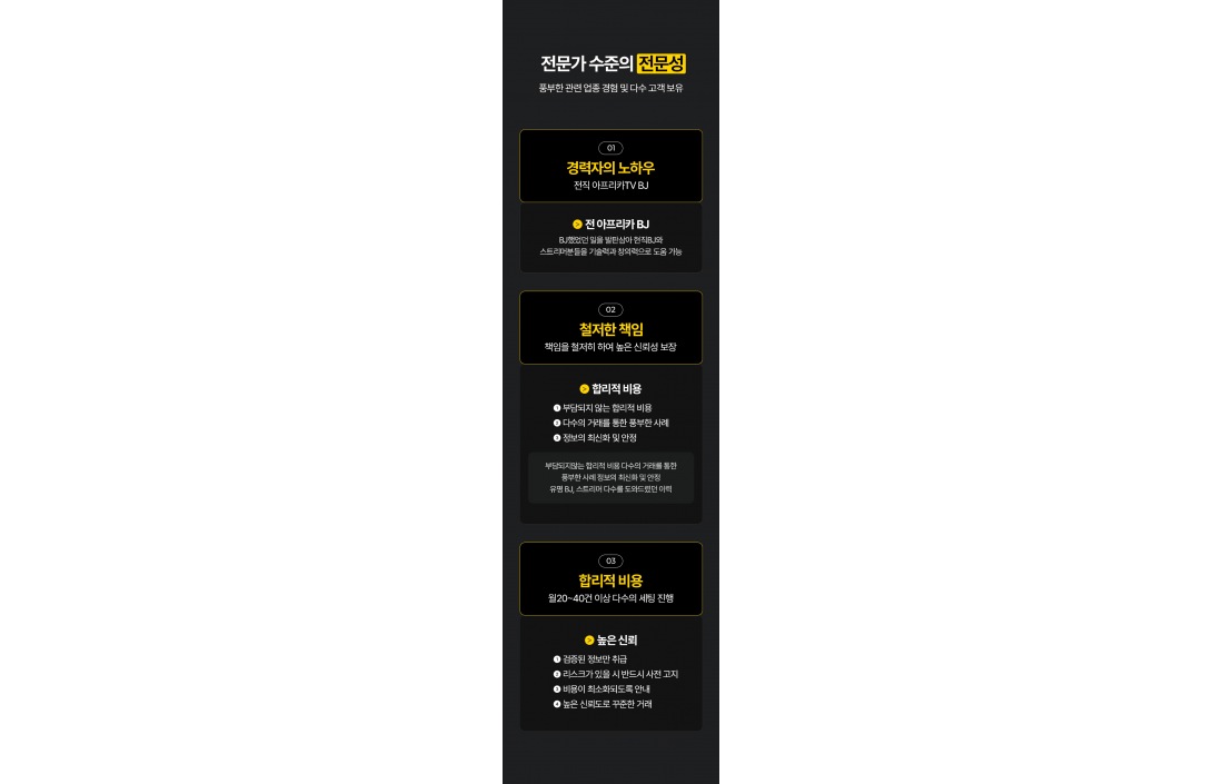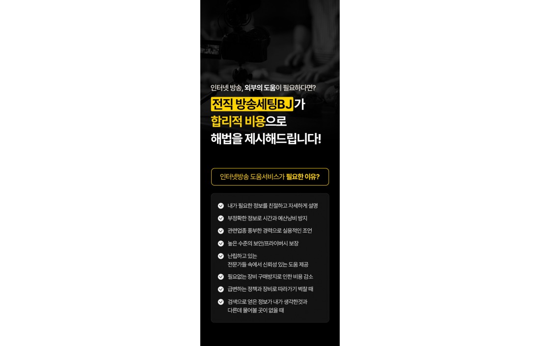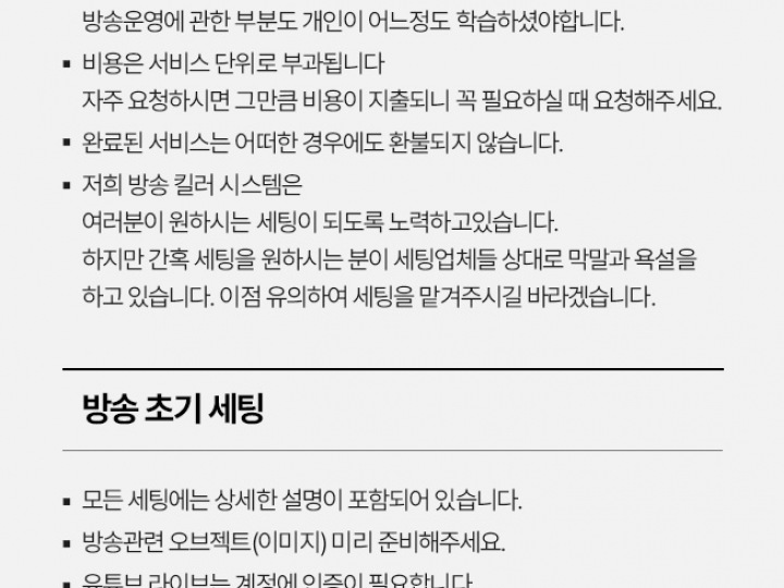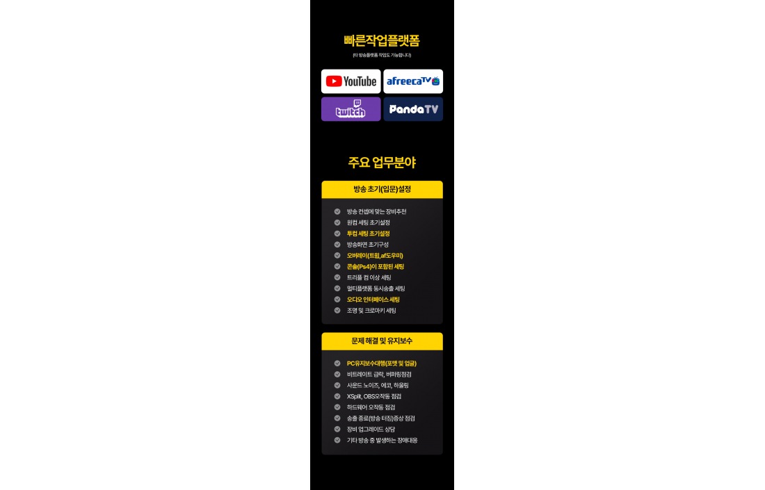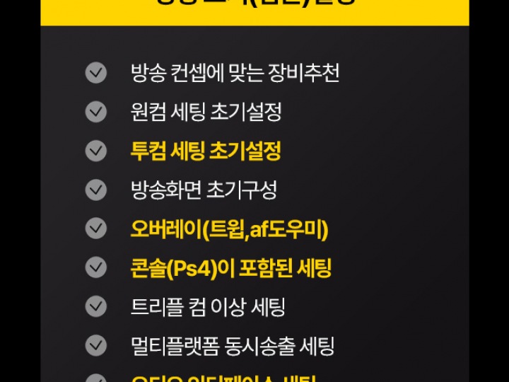 2016~2021 前아프리카 전문 세팅BJ 빠른 판단력 으로 해결가능합니다. 원컴 및 투컴 모든 방송세팅 관련 문제해결 가능합니다. 그외 컴퓨터응용기술로 PC점검 문제해결도 쌉가능합니다. 피움마켓을 시작해서 더 많은 신입BJ 스트리머 양성 및 인터넷방송 준비할 수 있는 환경을 만들고 유명BJ 스트리머분 또한 더 이상 세팅에 어려움이없었으면하는바램 저도 인터넷방송했기때문에 BJ들의 공감대 형성까지하면서 방송세팅관련해서 상담해드리고있습니다