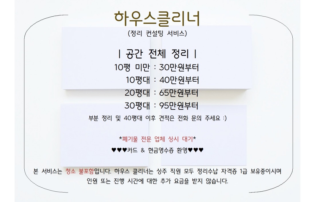 본 서비스는 청소 불포함입니다. 하우스 클리너는 상주 직원 전원 정리 수납 자격증 1급 보유중이시며