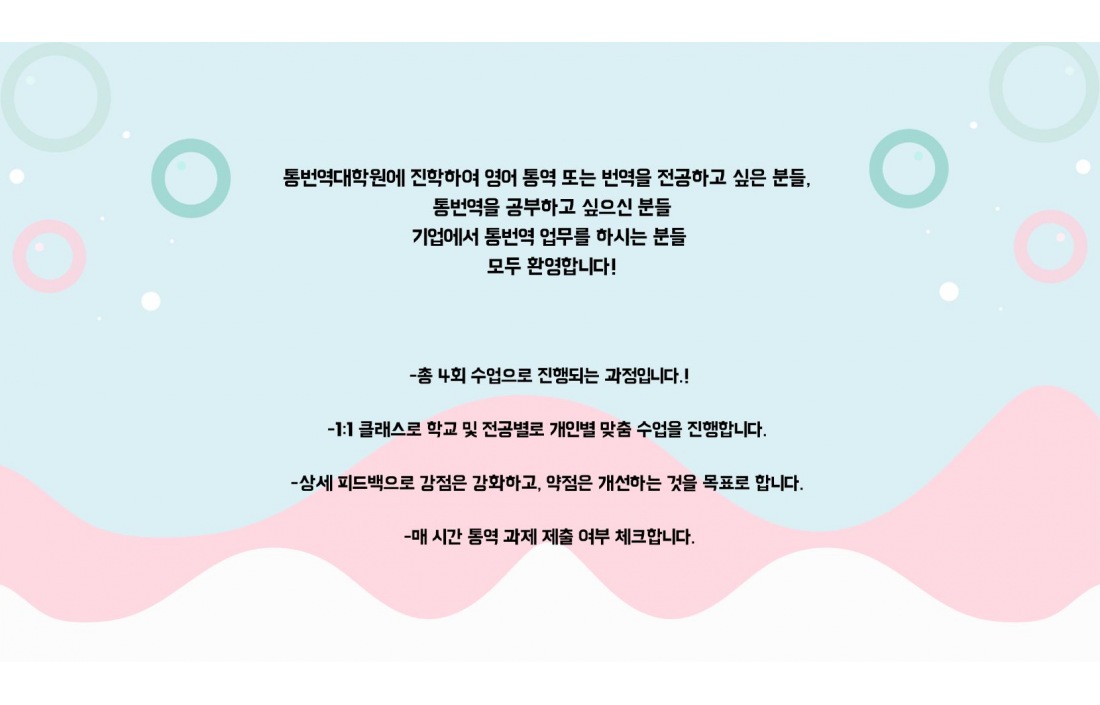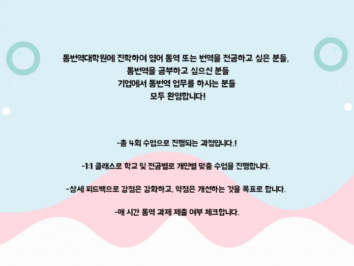 -1회차 수업: 통역구술 훈련 (60분): 지문 낭독 후 통역, 피드백 제공, 단점 보완 후 완성연습.