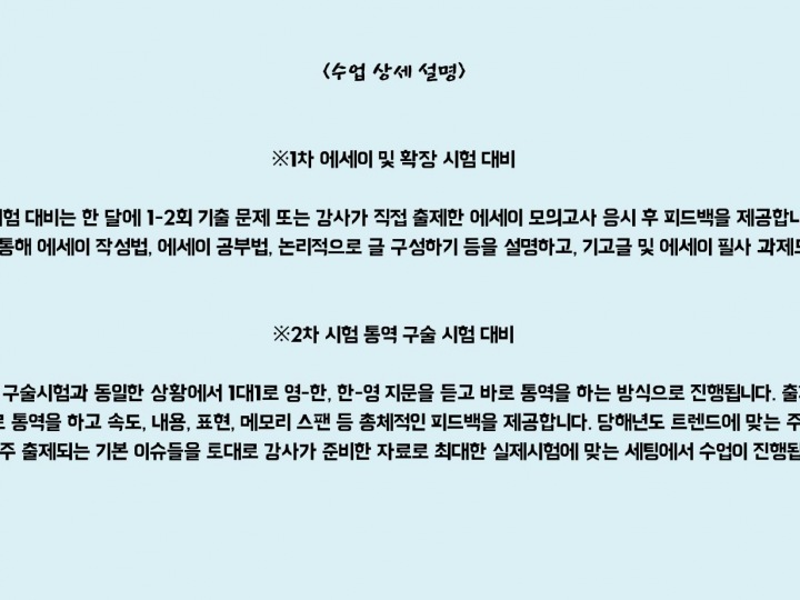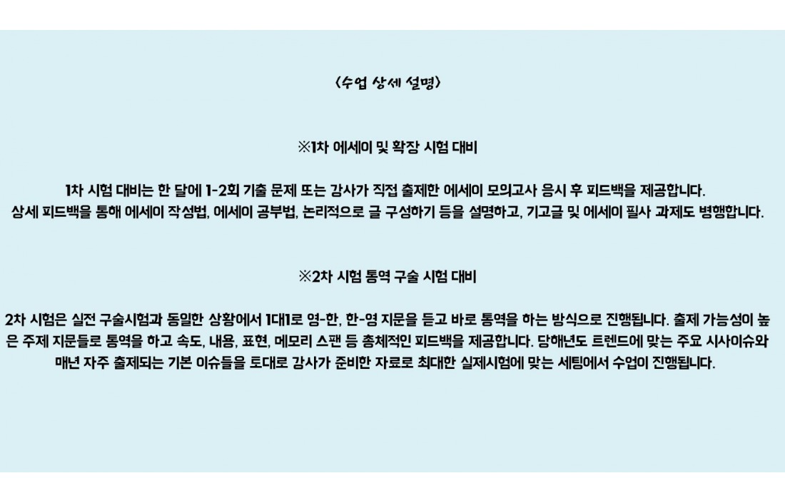: 지문 낭독 후 통역, 피드백 제공, 단점 보완 후 완성연습. 지문 낭독 후 통역, 피드백 제공, 단점 보완 후 완성연습. 강사가 직접 출제한 빈출 주제 지문으로 실제 시험에 출제되는 분량으로 낭독을 하면 학생분이 통역 발표를 한 후 상세 피드백을 제공합니다.