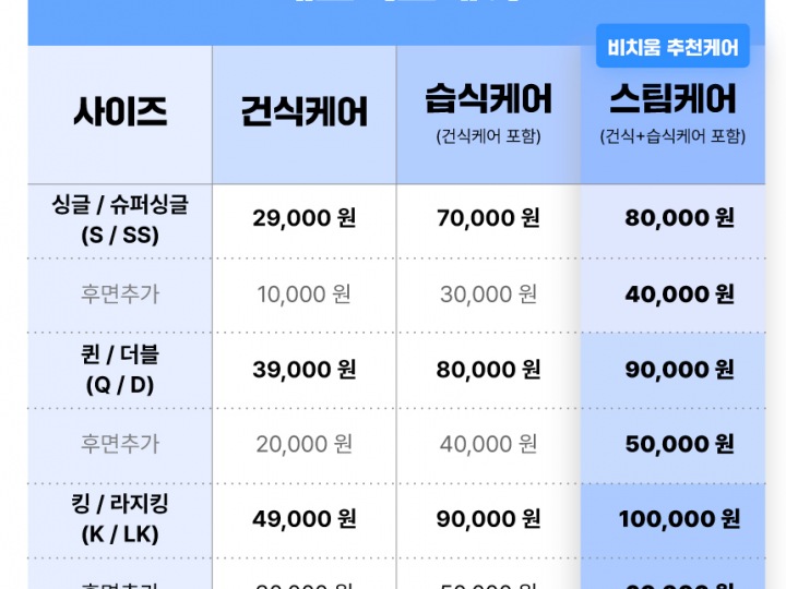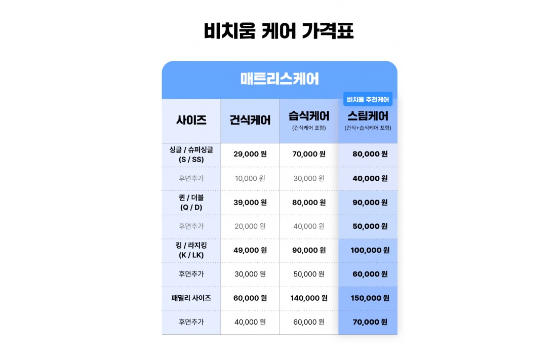 매트리스 건식, 습식 스팀 케어를 제공해 드리고 있으며 원하시는 케어서비스를 상담을 통해 견적을 최종적으로 선택하시면 해당 서비스에서 예약금인 기본금액 차감하여 현장에서 결제 가능합니다.