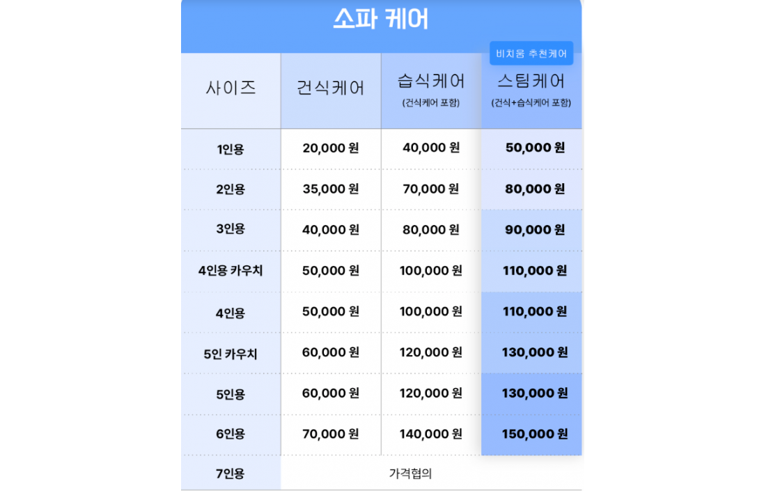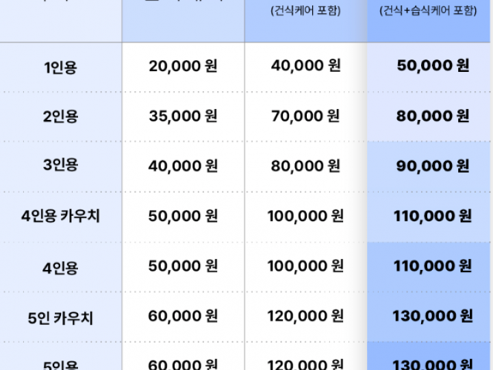7. 케어 마무리 케어가 완료된 후, 꼼꼼하게 뒷정리를 하고 추가 설명을 드립니다. 맞춤형 서비스 건식, 습식, 스팀케어는 각각 별도로 제공되며, 소독과 공기정화 서비스는 기본으로 포함됩니다.